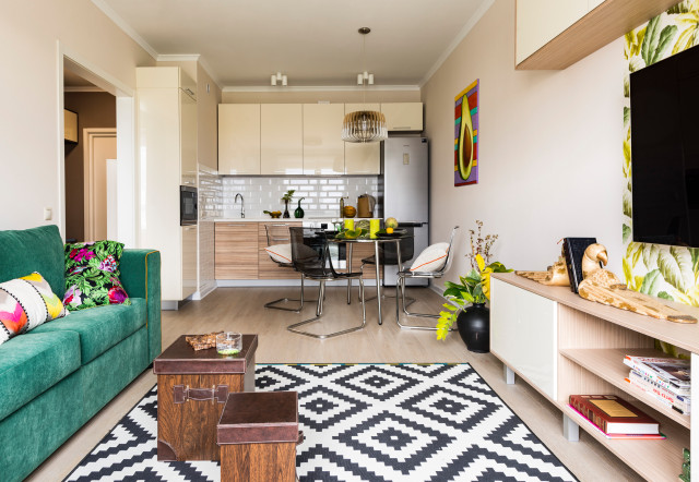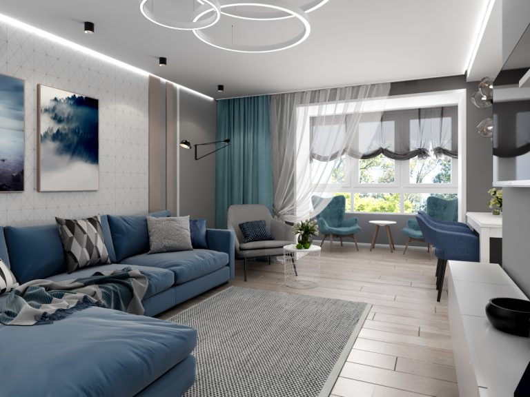 Современная гостиная для квартиры в новостройке Цветовая палитра: Нейтральные цвета: белый, серый, бежевый Акцентные цвета: синий, зеленый, оранжевый Мебель: Модульный...