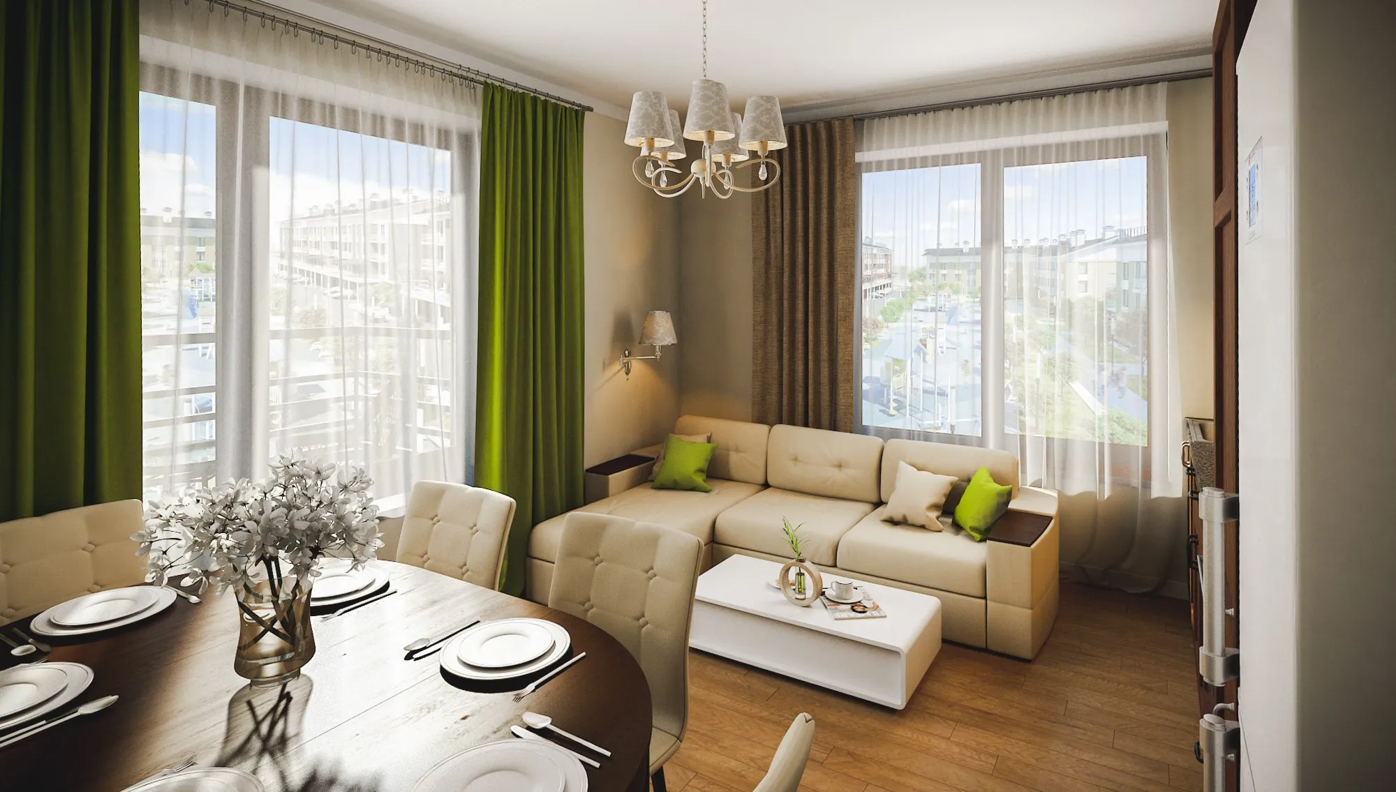 Яркие акценты (например, бирюзовый, желтый, оранжевый) для оживления интерьера.